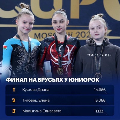 В личном зачете среди юниоров Елизавета Малыгина заняла 3 место в упражнениях на брусьях.