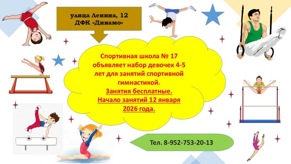 Спортивная школа № 17 проводит набор девочек 4-5 лет для занятий спортивной гимнастикой. Начало занятий с 12 января 2026 г.