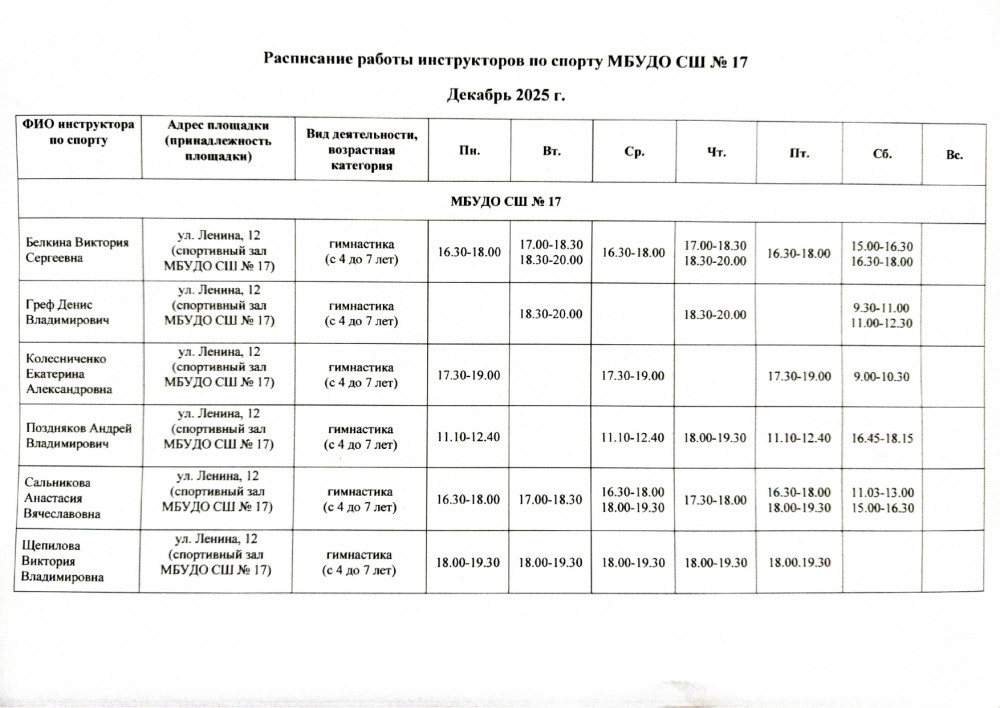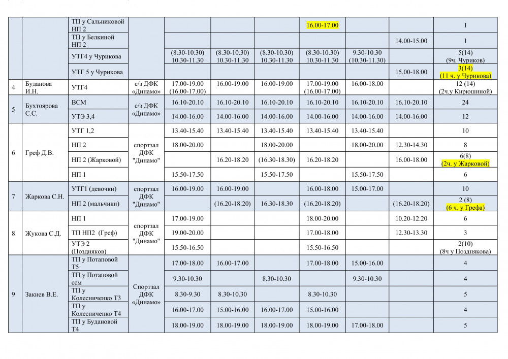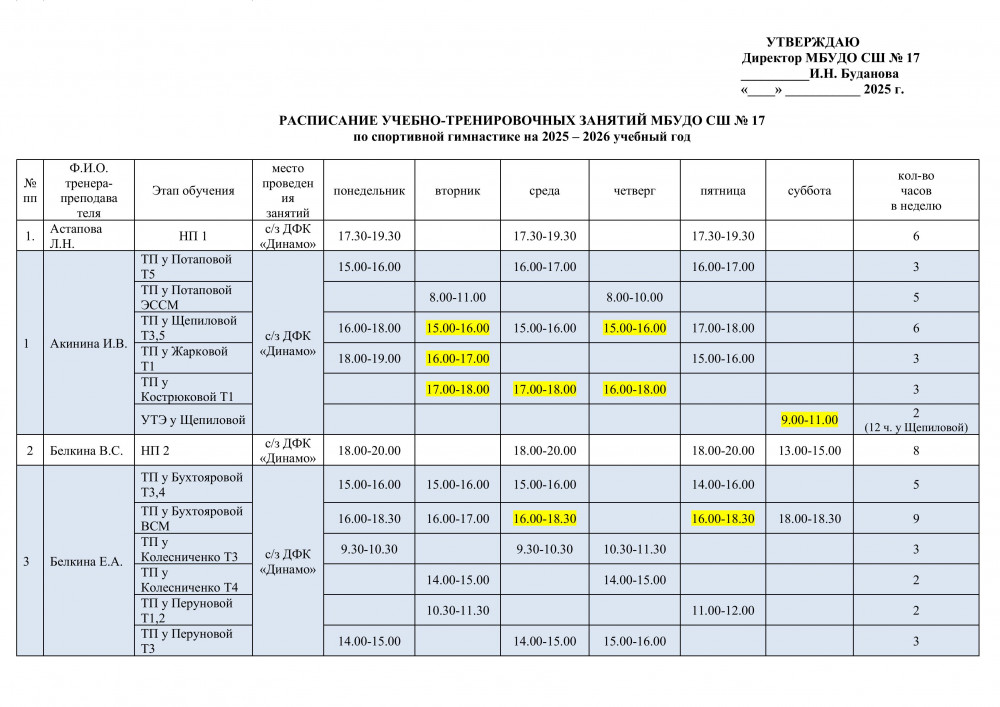 Расписание учебно-тренировочных занятий на 2025-2026 учебный год